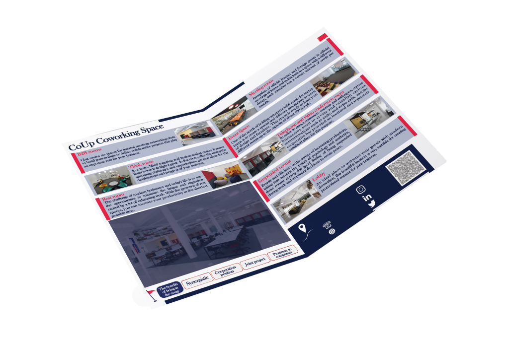 Co-up needed a visual identity that was in line with the interior design architecture and decoration of its physical space. The interior architecture of the coup is designed in a minimal style and uses dark red, yellow, red, white, and gray colors.